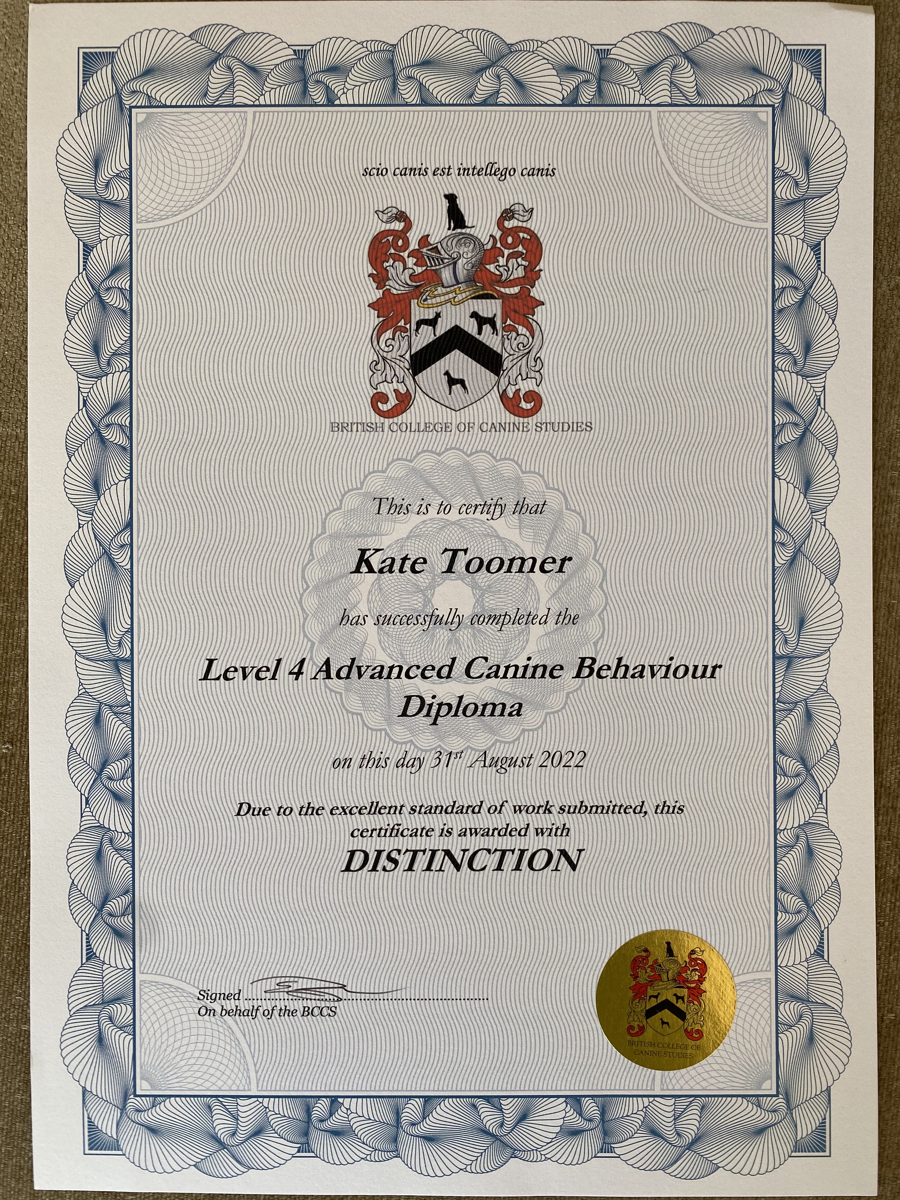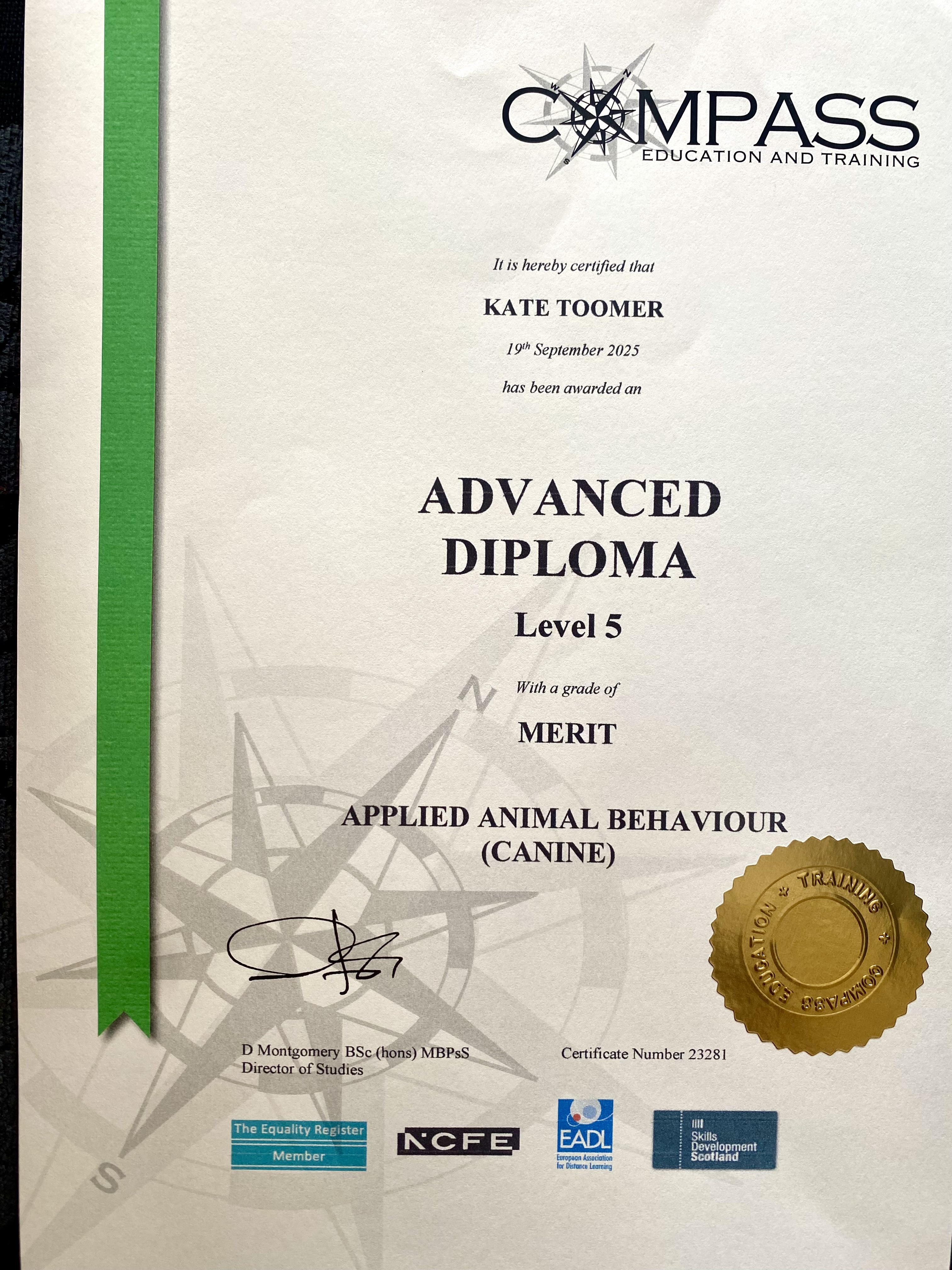 I’ve completed my HND/Foundation Degree (Level 5) Advanced Applied Animal Behaviour (Canine), in addition to Level 3 and 4 Advanced Canine Behaviour Diploma [Distinction], Dogs & Children Certificate, Dog Training Instructors Course, a Separation Anxiety Webinar and a qualified Fun Dog Agility Coach [Distinction].