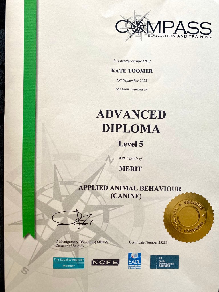 September 2025 – Successfully completed my dog behaviour Higher National Diploma/Foundation Degree (83.6%) – Advanced Applied Animal Behaviour Level 5 – Canine.