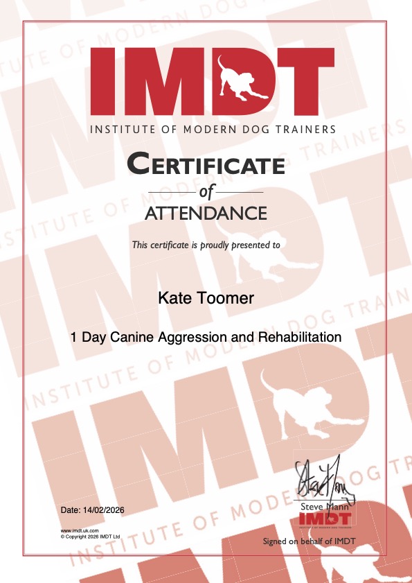 On-going Study – Continuing Professional Development (CPD) – Further to qualifying as an Animal Behaviour Technician (Level 5), I continue to study and research to support and expand on my knowledge. Here is the ever-growing list of my additional learning: Separation Anxiety and Related disorders (IMDT); Dogs & Children Certificate (BCCS); Arousal Regulation is key to Behaviour Modification (APBC); Canine Adolescence (IMDT); Webinar – A Metaphor on Wolves – Marco Addo (ISCP); Webinar – Dog Play – Dr Marc Bekoff (ISCP); Webinar – Aggression Cases – Mike Shikashio (ISCP); Webinar – All about CBD Oil – Dr Lennon Foo (ISCP); Canine Aggression and Rehabilitation (IMDT);