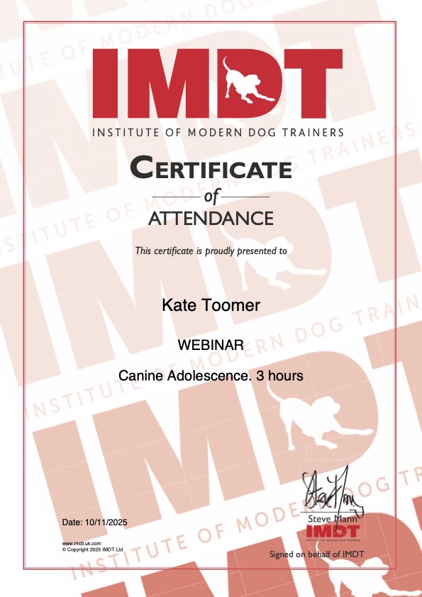 Continuing Professional Development (CPD) – Further to qualifying as an Animal Behaviour Technician (Level 5), I continue to study and research to support and expand on my knowledge. Here is the ever-growing list of my additional learning: Separation Anxiety and Related disorders (IMDT); Dogs & Children Certificate (BCCS); Arousal Regulation is key to Behaviour Modification (APBC); Canine Adolescence (IMDT);