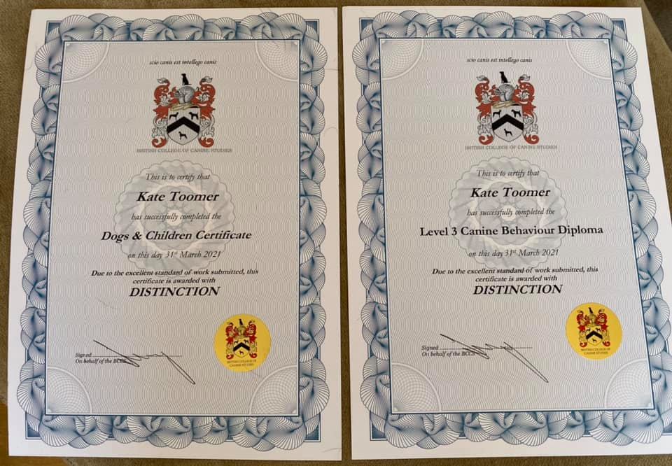 Dogs and Children Certificate – Certificate of Achievement [DISTINCTION] – British College of Canine Studies (BCCS) – March 2021 – Looking at dog behaviour with a focus on risks and highlights within a family environment.