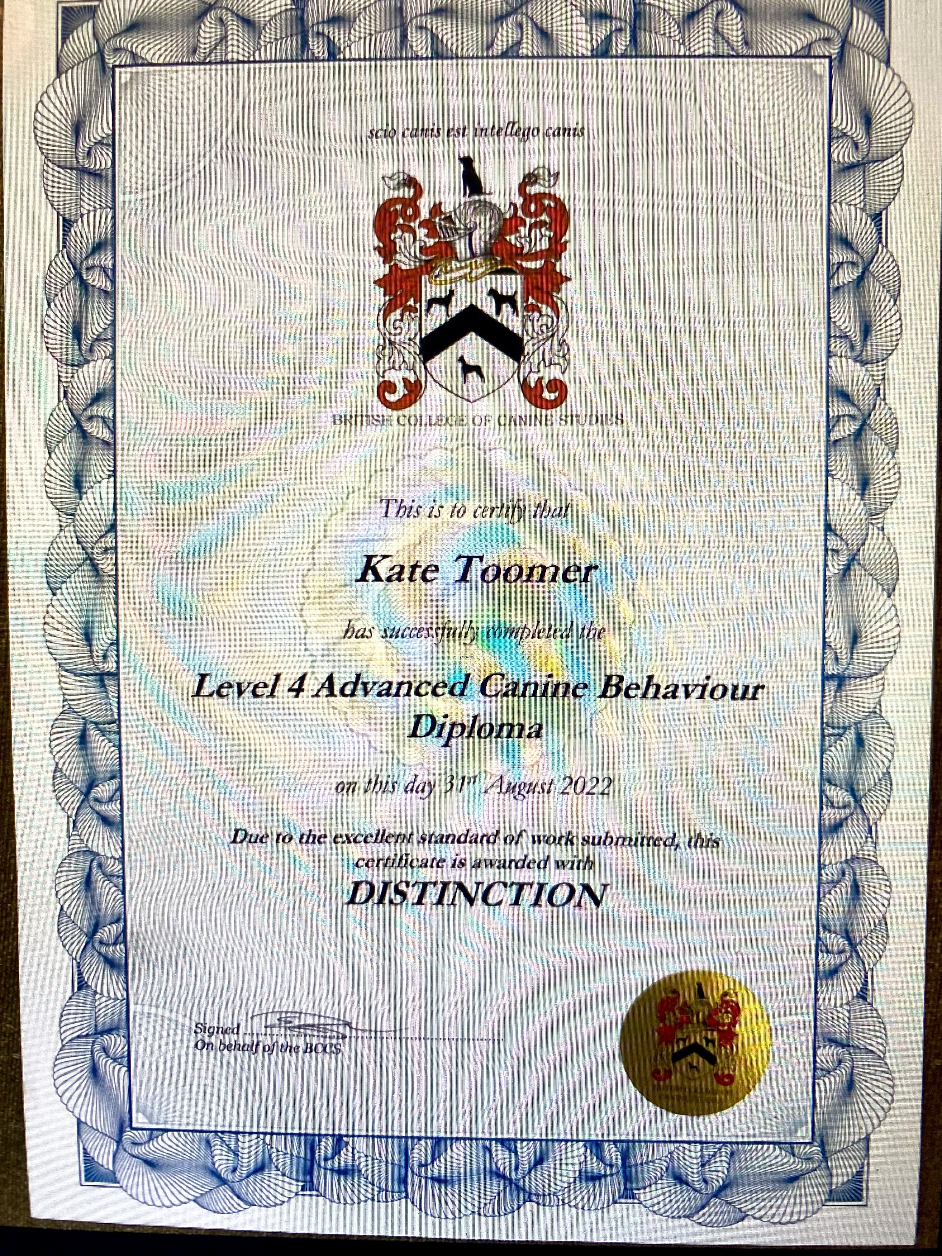 Level 4 PETbc Accredited Advanced Canine Behaviour Diploma – (BCCSDip.AdvCanBhv) [DISTINCTION] – British College of Canine Studies – July 2022